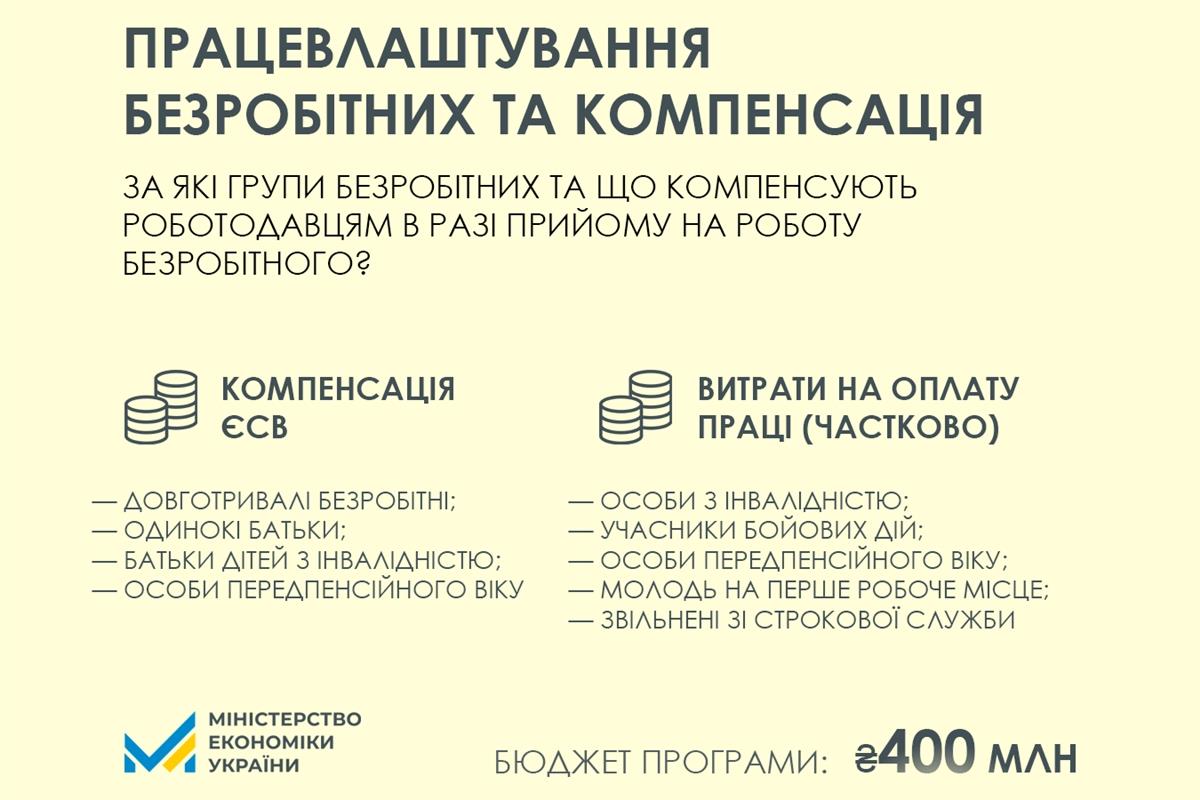 1) компенсації фактичних витрат у розмірі єдиного внеску на загальнообов’язкове державне соціальне страхування за відповідну особу за місяць, але не більше подвійного розміру мінімального страхового внеску — за працевлаштування роботодавцем строком не менше ніж на 2 роки за направленням центру зайнятості зареєстрованих безробітних з числа осіб, які мають додаткові гарантії у працевлаштуванні та перебувають у статусі зареєстрованого безробітного понад 1 місяць. Зокрема, таких категорій населення: