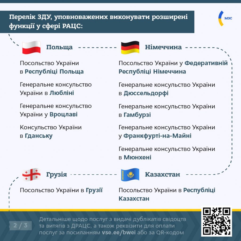 В умовах воєнного стану, починаючи з лютого 2023 року, закордонні дипломатичні установи, визначені Міністерством закордонних справ України, окрім дій, що вчинялися ними раніше у сфері державної реєстрації актів цивільного стану (ДРАЦС), отримали додаткові повноваження, зокрема:
